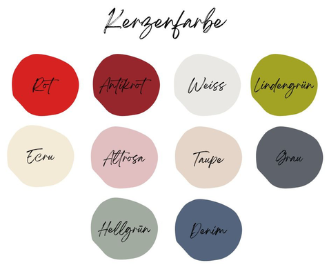 Kerzenfarben: Rot, Antikrot, Weiss, Lindengrün, Ecru, Altrosa, Taupe, Grau, Hellgrün oder Denim. Ihr seid euch nicht sicher, welche Farbe euch am besten passt? Dann schaut doch ganz unten bei unserem Farbschema vorbei.