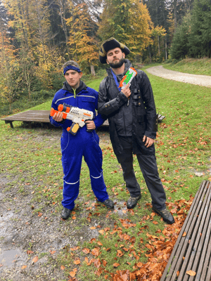 Für das nächste Spiel zieht der Butler das Video-Spiel "Fortnite" aus der Tasche. Und ab da geht es ziemlich schnell! Einige Charaktere aus Fortnite (sogenannte Skins) kommen angerannt: Wir müssen schleunigst weg, denn der Sturm zieht auf! Sofort machen wir uns auf. Um dem Sturm zu entkommen, stürzen wir uns mitten ins Geschehen. Dazu erspielen wir uns zuerst den Schild-Trank als Schutz. Anschliessend geht es mit einem Real-Life Fortnite rund, inklusive verstecktem Lama, Medi-Kits und einer ganzen Menge Action. Am Ende schaffen es nicht ganz alle, aber die Besten in die Mitte, um dem Sturm zu entkommen. Und mit der Siegergruppe können wir das Spiel dann auch abschliessen und uns von dem ganzen Regen, den der Sturm leider auch ins Real-Life gebracht, erholen.